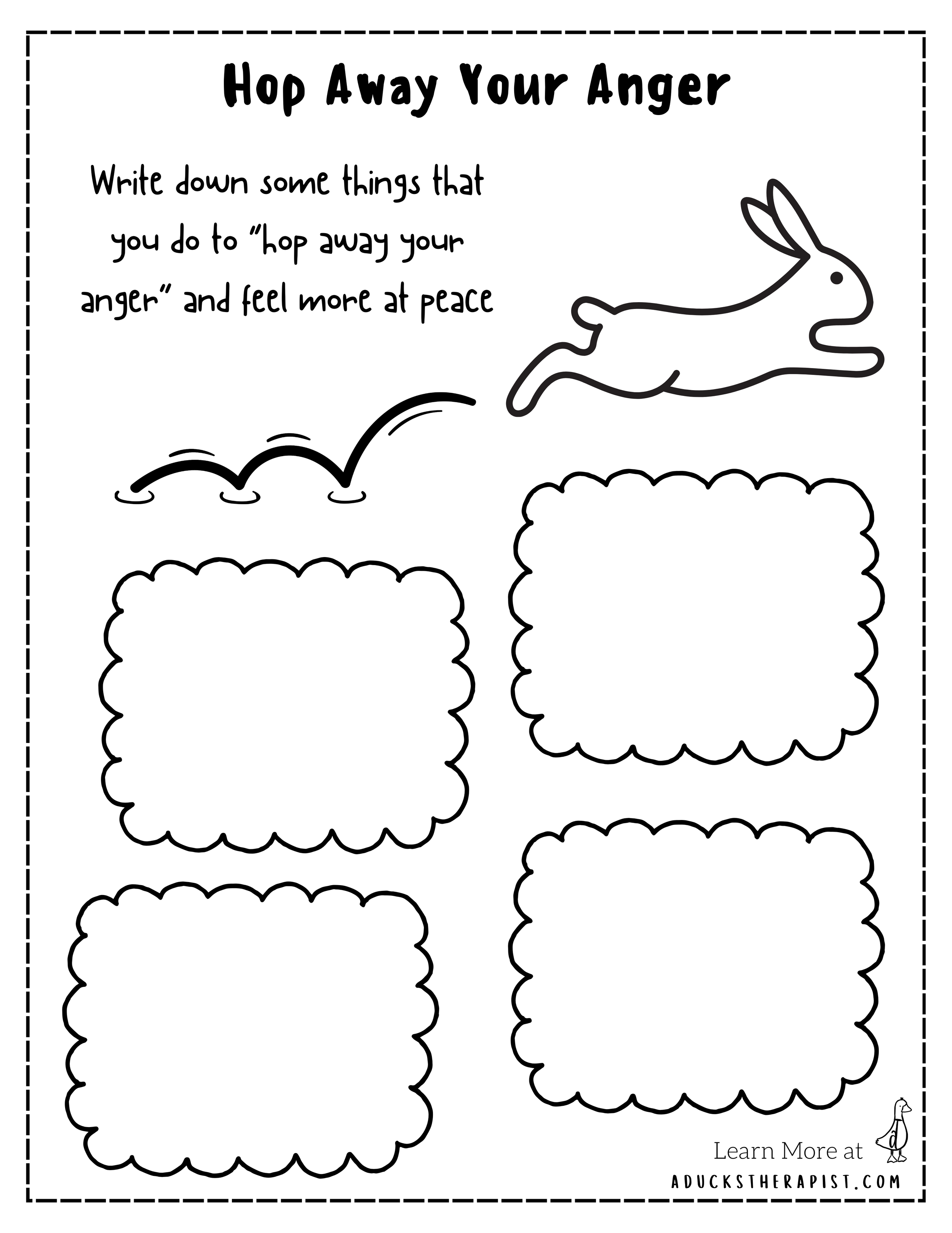 Hop Away Your Anger is a worksheet designed to help children identify and articulate their personal anger coping strategies. This activity invites children to externalize anger as something they can move through rather than something that traps them.