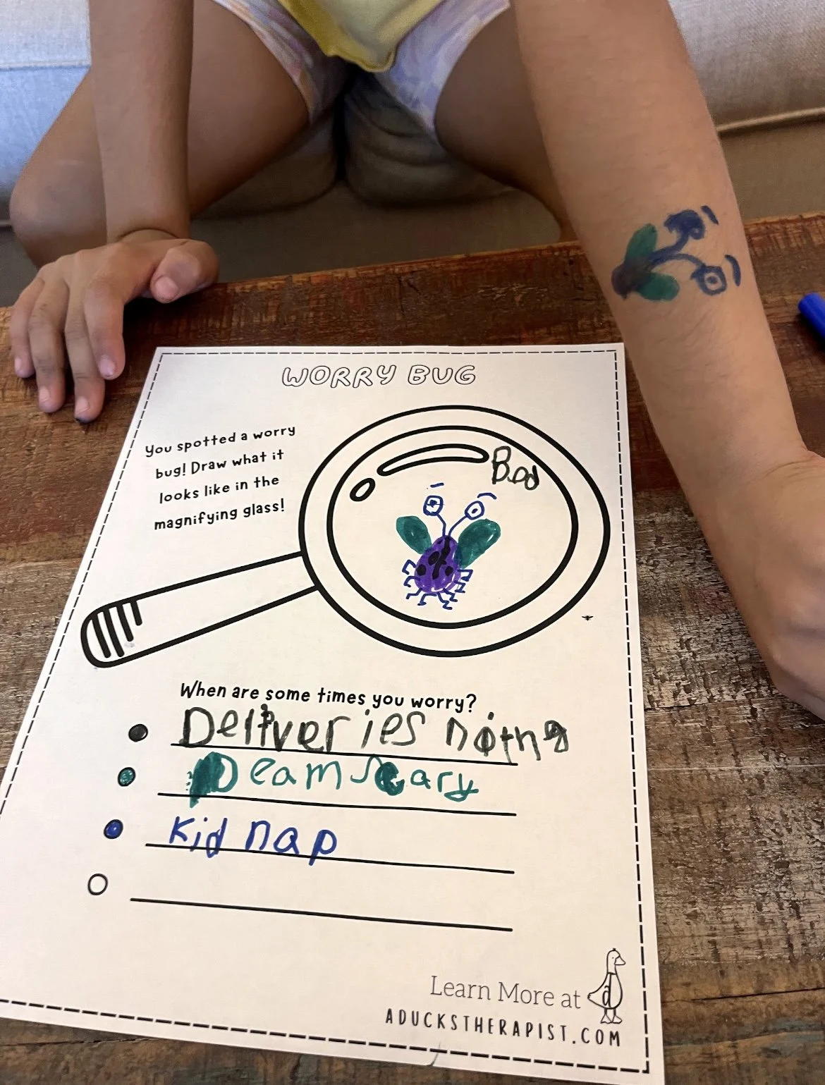 An anxiety externalization tool that uses the creative metaphor of examining worries under a magnifying glass. Children draw their worry as if it were a bug, then list specific times when they experience worry. This exercise helps distance children from their worries and makes anxiety feel more manageable and observable.